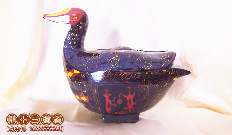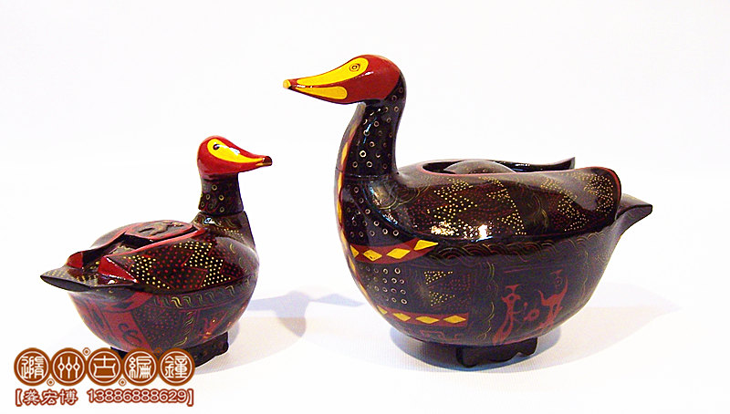 簡介:鴛鴦盒為木胎其身,體分兩半,制作再粘合成,頭頸與身體則榫卯相連,故頭能自由轉(zhuǎn)動(dòng)。背上有一長方形口與蓋相扣合,蓋上浮雕龍紋。整器外髹黑漆,其上用紅色和金色描繪眼、嘴、羽毛以及菱形紋等。在它的腹部還描繪了建鼓舞和撞鐘擊磬的情節(jié)畫。