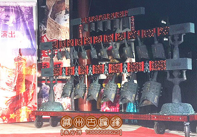編鐘全部為錫青銅鑄造而成,采用國際標(biāo)準(zhǔn)樂音音高A=440Hz調(diào)音,可以旋宮轉(zhuǎn)調(diào)演奏古今中外樂曲,編鐘大梁采用優(yōu)質(zhì)實(shí)木板制作,表面噴漆,彩繪花紋;另配有保管編鐘用的木箱,便于運(yùn)輸和儲存。編鐘底部可以安裝滑輪系統(tǒng),在舞臺上方便移動,2人配合可輕松迅速移動到舞臺合適的位置。